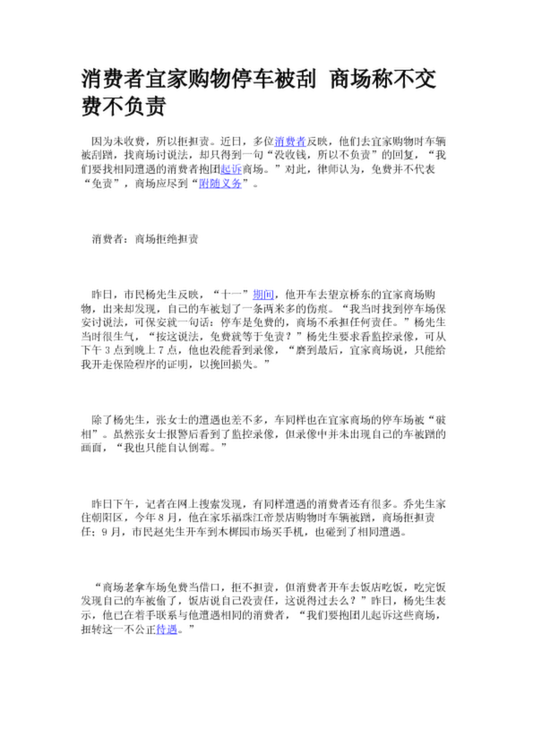 消費者宜家購物停車被刮 商場稱不交費不負責