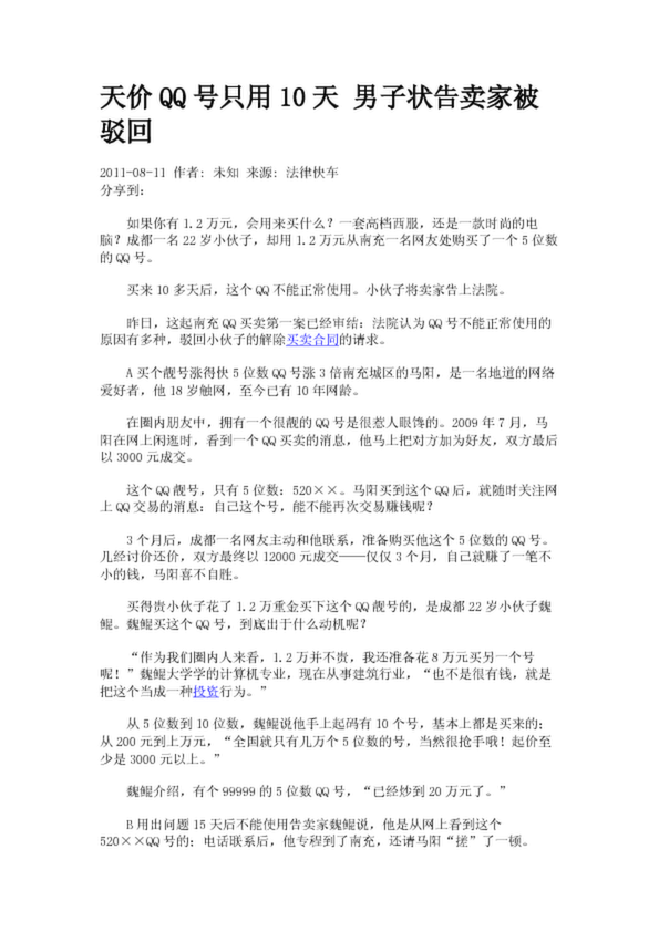 天價(jià)QQ號(hào)只用10天 男子狀告賣家被駁回