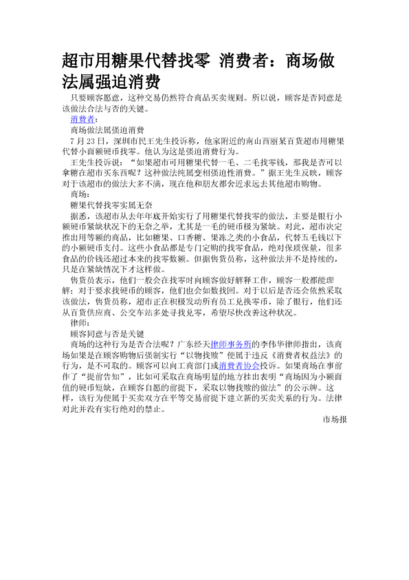 超市用糖果代替找零 消費者:商場做法屬強迫消費(20.44KB)