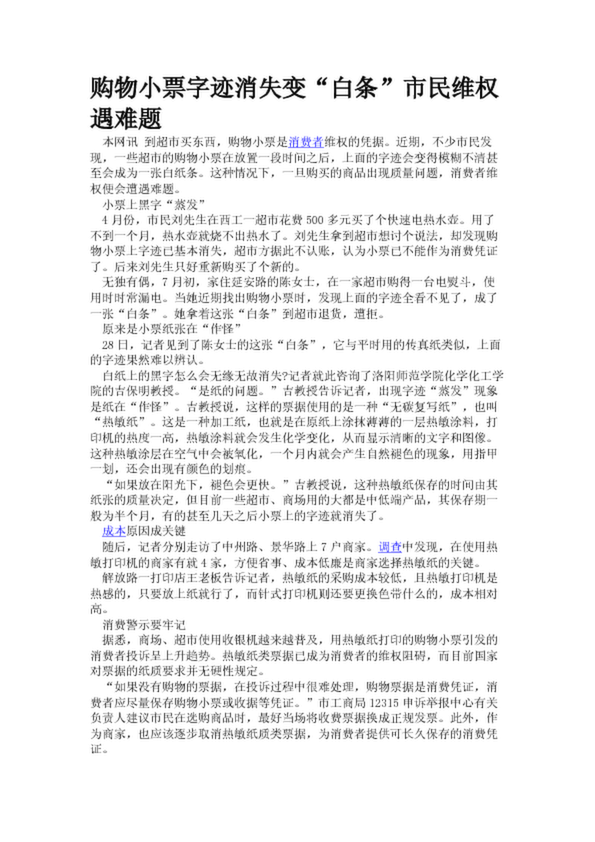購物小票字跡消失變“白條”市民維權遇難題