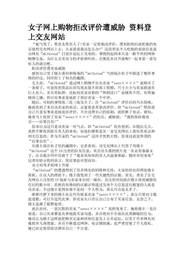 女子網上購物拒改評價遭威脅 資料登上交友網站(22.56KB)