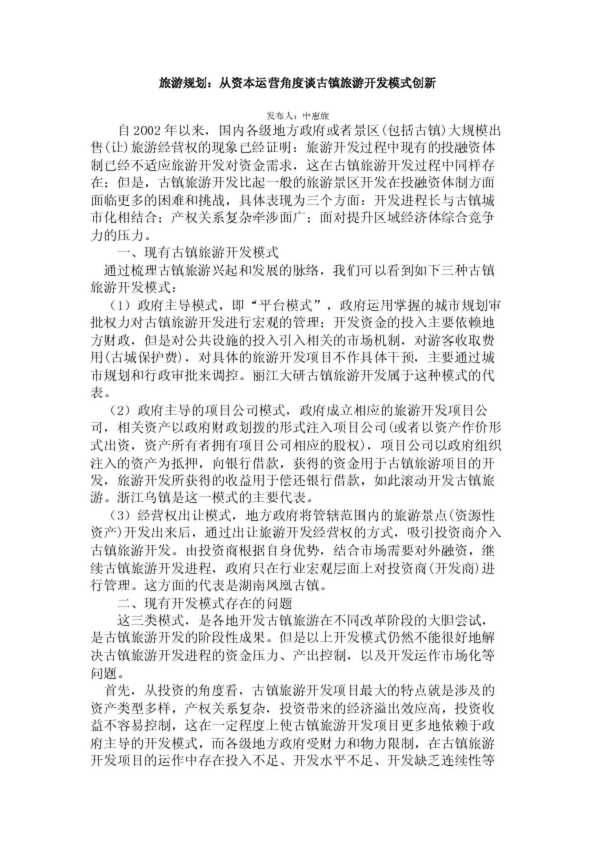 旅游規(guī)劃:從資本運營角度談古鎮(zhèn)旅游開發(fā)模式創(chuàng)新