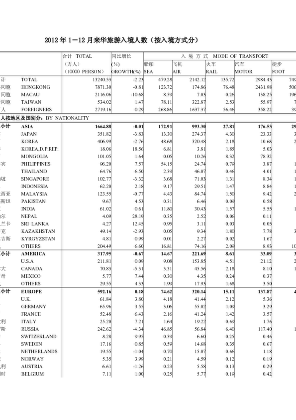 2012年1-12月來華旅游入境人數(按入境方式分)(0.11MB)