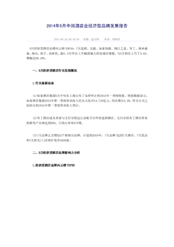 2014年5月中國酒店業(yè)經(jīng)濟型品牌發(fā)展報告