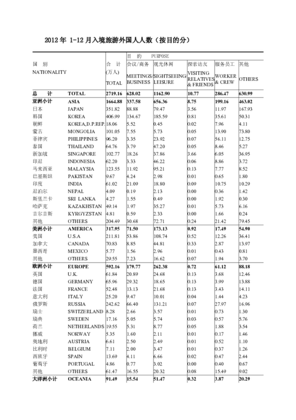 2012年 1-12月入境旅游外國人人數(按目的分)