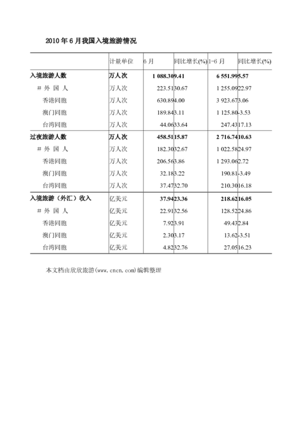 2010年6月我國入境旅游情況
