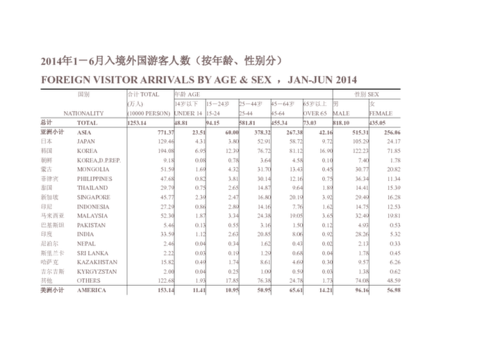 2014年1-6月入境外國游客人數(按年齡、性別分)