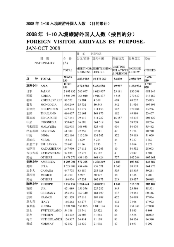 2008年 1-10入境旅游外國人人數(shù) (目的累計(jì))