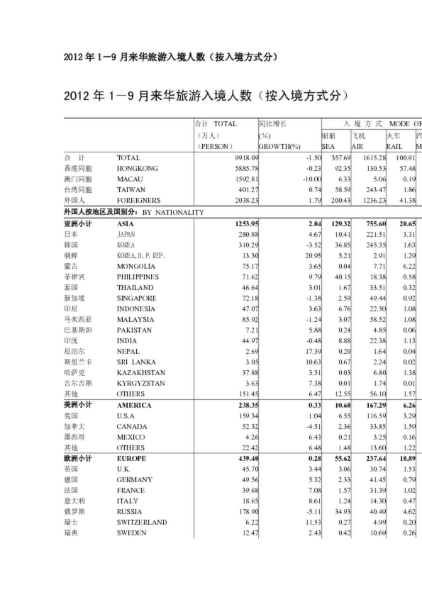 2012年1-9月來華旅游入境人數(按入境方式分)(0.11MB)